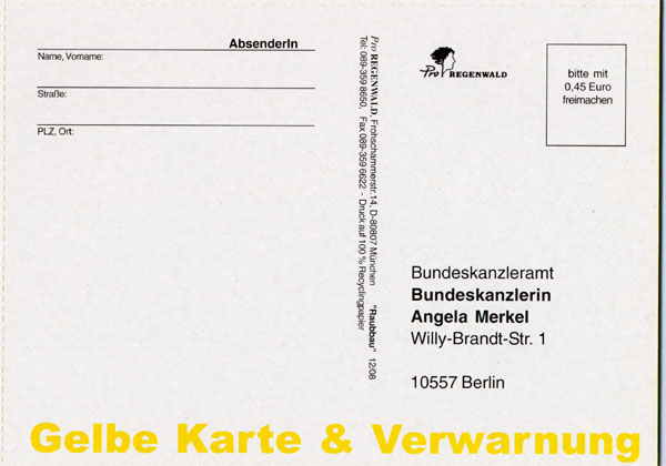 vom 30.12.2008München - Umweltschützer lassen die Bundeskanzlerin für grobes Foulspiel an der Umwelt Gelb sehen. In einer von Pro REGENWALD initiierten Aktion verwarnen tausende VerbraucherInnen Angela Merkel mit gelben (Post)karten und fordern konsequenteres und engagierteres Spiel im nächsten Jahr. Kritisiert wird, dass die Kanzlerin den Klimaschutz neuerdings gegen ökonomische Stabilität und Arbeitsplätze ausspiele, anstelle die zugrunde liegenden Probleme zu lösen. Zudem habe die Bundesregierung wieder ein Jahr vergeudet, ohne Maßnahmen gegen den illegalen Holzhandel und den Raubbau an Wäldern zu ergreifen.