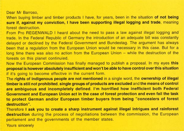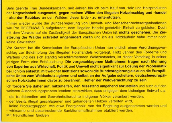 Mit der Verwarnung fordern die VerbraucherInnen von der Bundeskanzlerin konkret endlich Maßnahmen gegen den Handel mit illegalen Hölzern und Holzprodukten. Derzeit gibt es dank der Untätigkeit der Bundesregierung kein Mittel, sicherzustellen, dass man kein Holz aus Raubbau kauft und sich damit zum 'Hehler der Waldvernichtung' macht. Der Handel mit illegal geschlagenen und importierten Holzprodukten ist in Deutschland immer noch erlaubt.