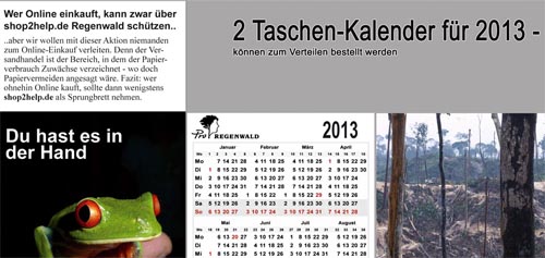 Auch im nächsten Jahr soll ein kleiner Taschenkalender daran erinnern, dass bei Online-Einkäufen Regenwald-Projekte gefördert werden können - wenn man seinen Einkauf über www.shop2help.de startet. Viele Shops zahlen eine Provision für 'Kundenvermittlung', die entweder Google reich macht oder von denen Preisvergleichsportale leben. Diese Provision würde mit jedem Einkauf unserer Projektarbeit zugeschrieben werden ... automatisch, wenn man nur über das Portal shop2help.de startet: 'Du hast es in der Hand'.