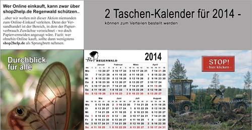 Auch dieses Jahr wieder soll ein kleiner Taschenkalender daran erinnern, dass bei Online-Einkäufen Regenwald-Projekte gefördert werden können - wenn man seinen Einkauf über www.shop2help.de startet. Viele Shops zahlen eine Provision für 'Kundenvermittlung', die entweder Google reich macht oder von denen Preisvergleichsportale leben. Diese Provision würde mit jedem Einkauf unserer Projektarbeit zugeschrieben werden ... automatisch, wenn man nur über das Portal shop2help.de startet: 'Durchblick für alle', also weitersagen!.