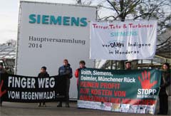 In Honduras liefert Siemens Turbinen für den 22 MW-Damm Agua Zarca. “Der Bau dieses Wasserkraftwerks verwehrt indigenen Gemeinschaften den Zugang zu ihren Lebensgrundlagen: dem Fluss und ihrem Ackerland. Die Betreiber terrorisieren die einheimischen Gegner mit Unterstützung des Militärs und der Polizei, die sogar schon einen lokalen Anführer umgebracht haben”, betont Andrea Lammers von der deutsch-österreichischen Honduras-Delegation. “Während eine finanzierende Bank und sogar die chinesische Firma SINOHYDRO wegen der Menschenrechtsverletzungen aus dem umstrittenen Projekt ausgestiegen sind, ist bei Siemens nicht das kleinste Anzeichen von Selbstreflexion zu entdecken.
